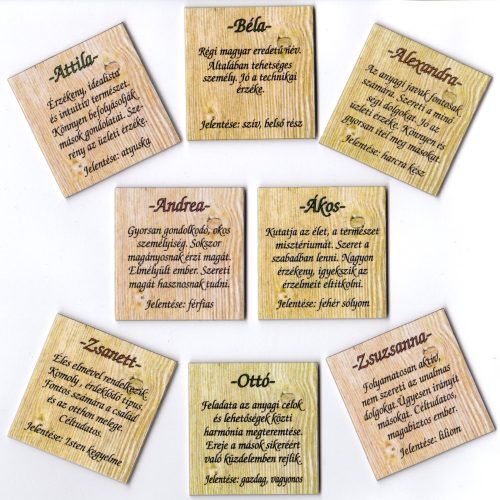 A név a legtöbb kultúrában különleges jelentéssel bír. Nem csupán hangzása teszi széppé, vagy épp különlegessé az egyes neveket, hanem jelentésüknek is sokszor kiemelt szerepe van. Sőt, sok helyen úgy vélik, a jelentés, amit a név hordoz, meg is határozza viselőjét és személyiségét. Ám, ha nem is vesszük ilyen komolyan ezeket a hagyományokat, akkor sem foghatunk mellé egy szépen elkészített, egyedi, neves hűtőmágnessel. Kedves kis ajándék barátnak, párunknak, kollégánknak.mérete 4,7 x 4,9 cm