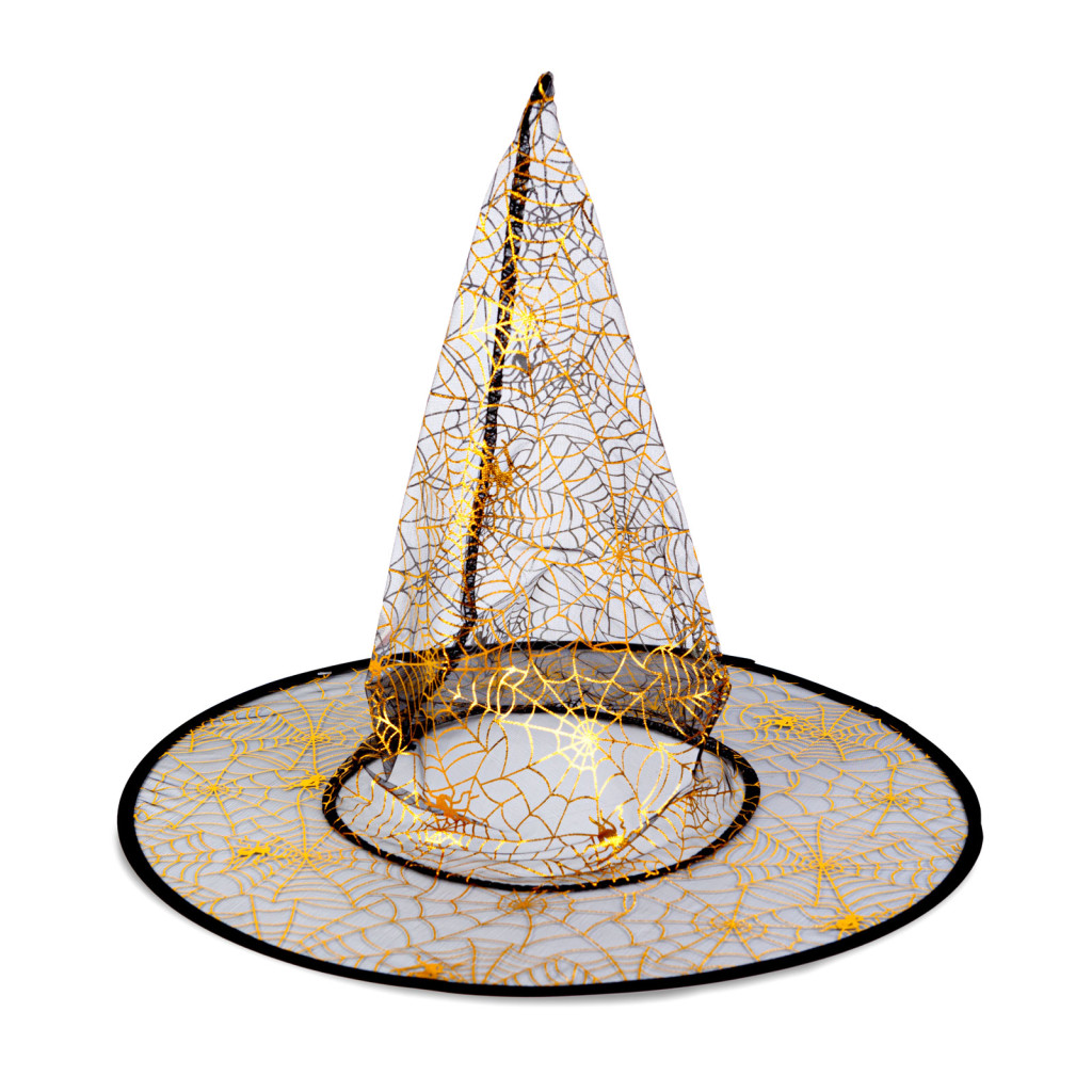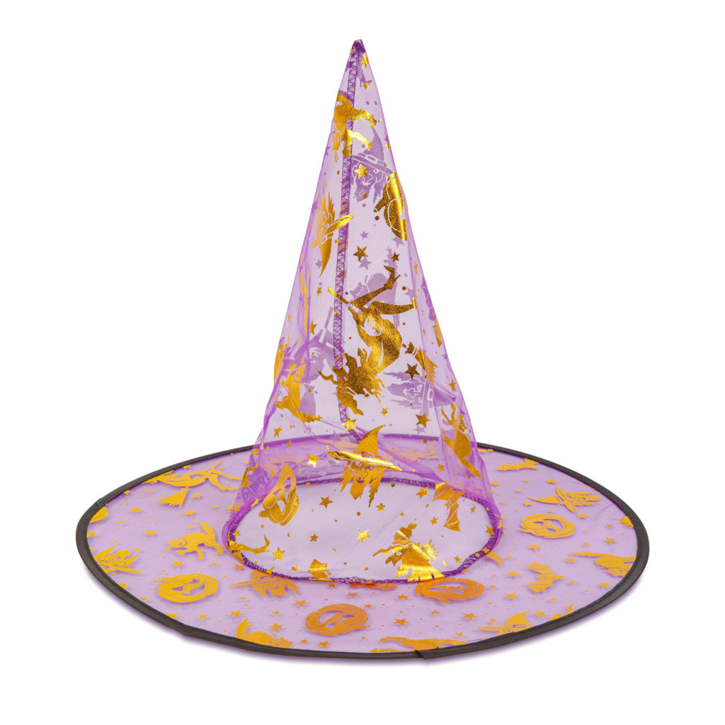 Hegyes, 4 színben kapható boszorkánykalap, amely kiváló halloween-i jelmez kiegészítő. A kalap külső részén aranyszínű, csillogós halloween-i motívumok találhatóak.